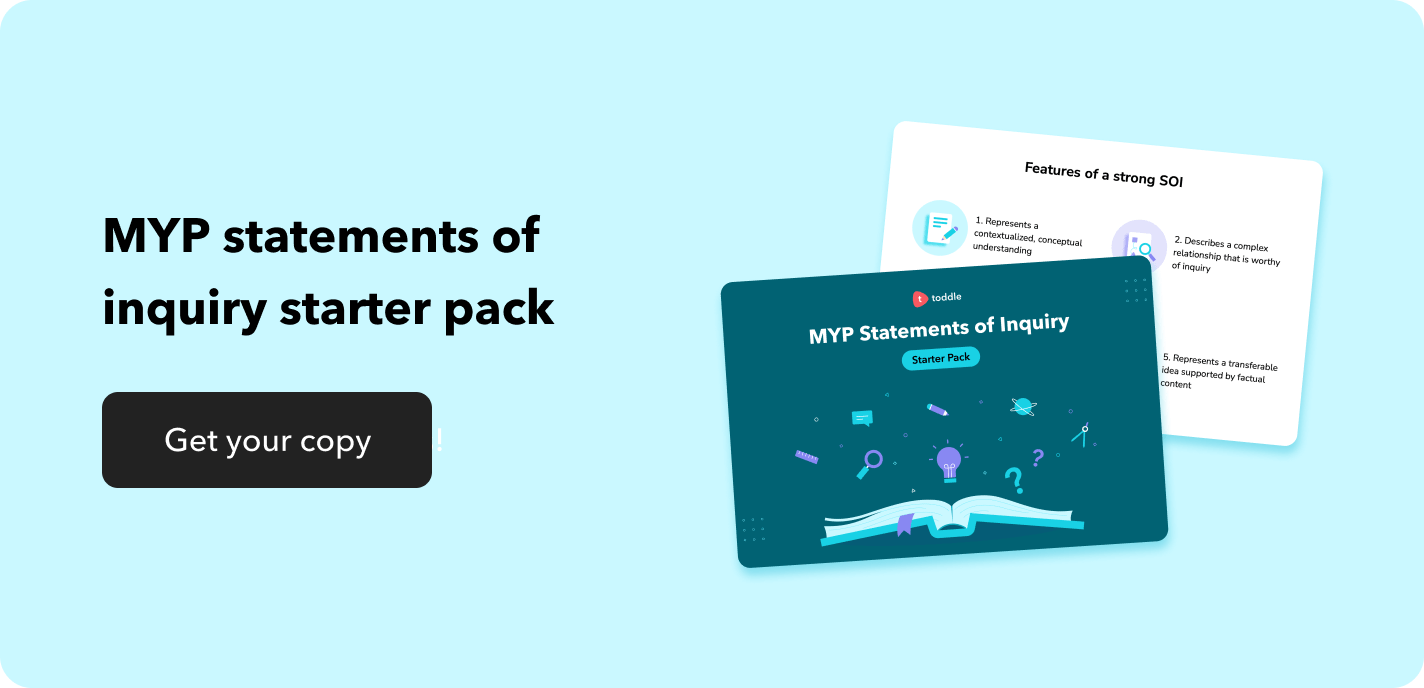 All MYP units have a ‘statement of inquiry’ or SOI. This is a meaningful statement that expresses the big idea of the unit, guides student inquiry, and also prompts connections outside of the unit. It is constructed by combining the key and related concepts with the global context.