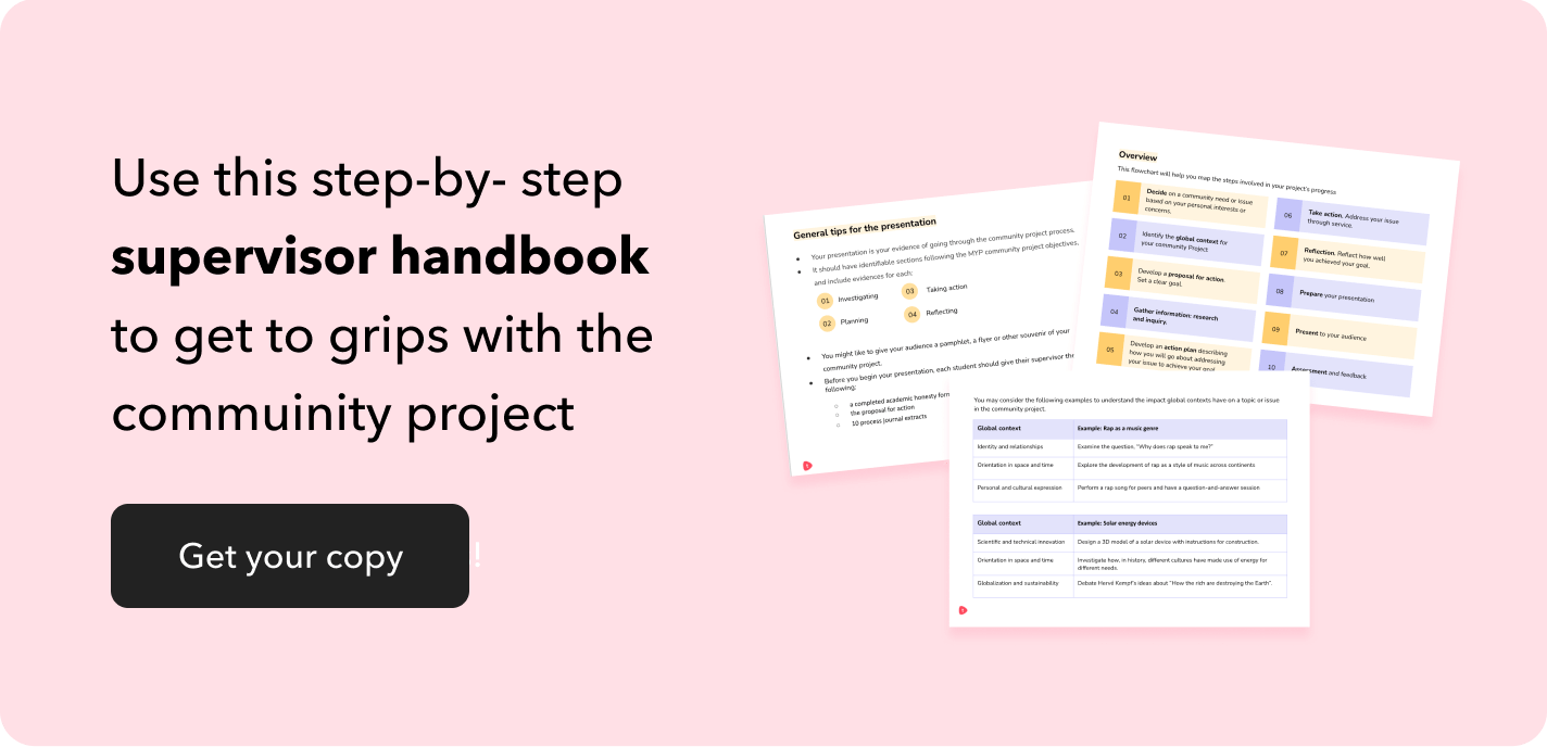 - Community project: The Community project focuses on service as action. Students work as individuals, or in groups, on a student-initiated service project. This is undertaken by students at schools offering MYP Year 3 or 4.