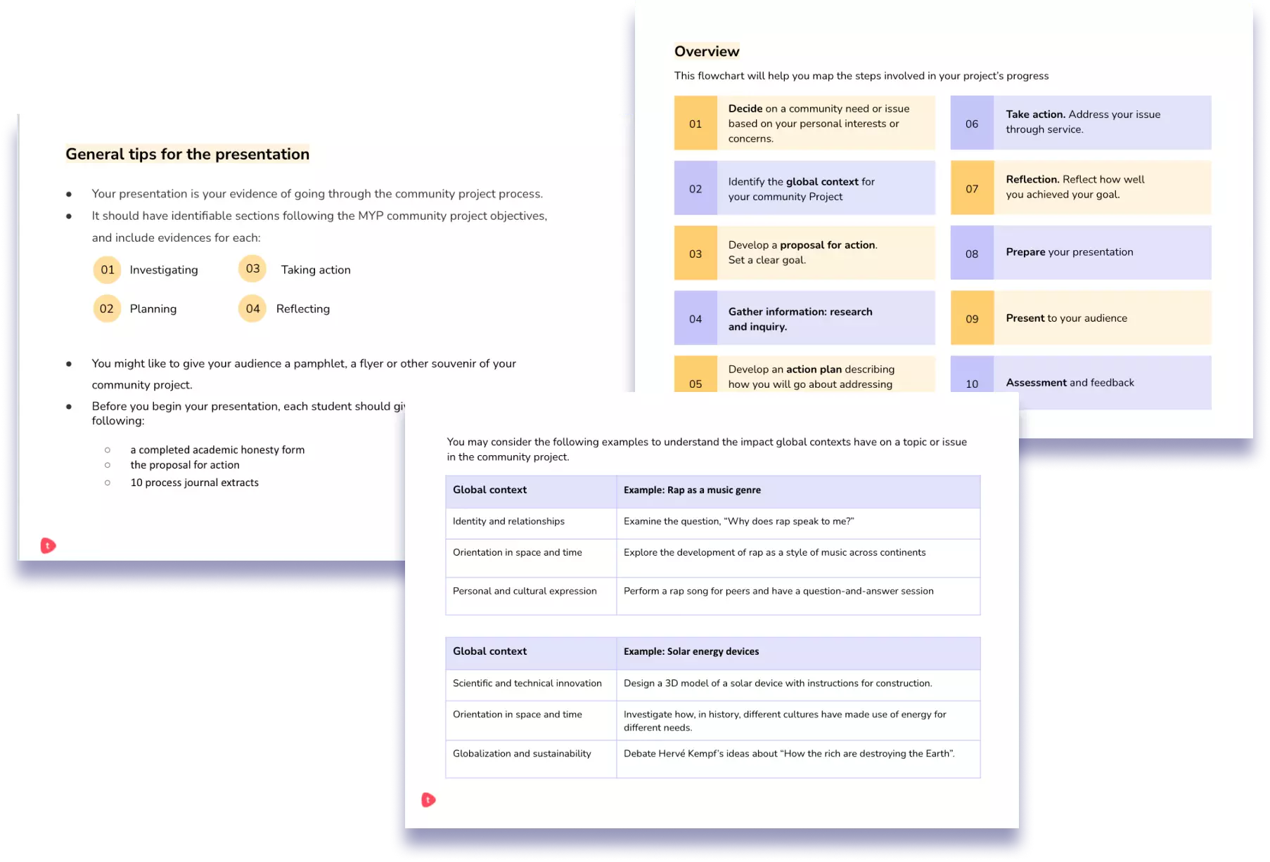 • Guidelines on the different aspects of the community project to share with students