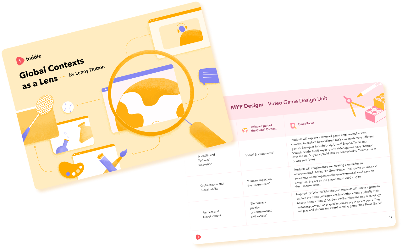 Disclaimer- This resource has been produced independently of and not endorsed by the IB. Toddle’s resources seek to encourage sharing of perspectives and innovative ideas for classroom teaching & learning. They are not intended to be replacements for official IB guides and publications. Views and opinions expressed by the authors of these resources are personal and should not be construed as official guidance by the IB. Please seek assistance from your school’s IB coordinator and/or refer to official IB documents before implementing ideas and strategies shared within these resources in your classroom.