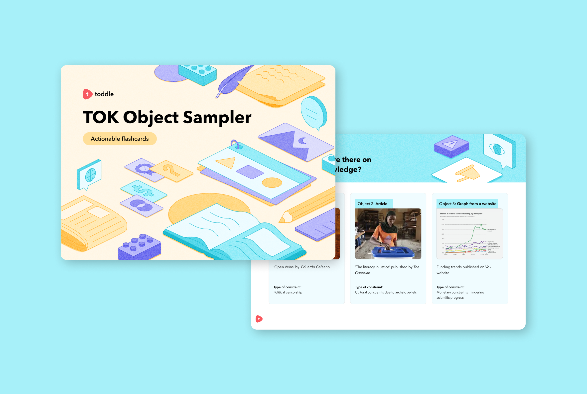 Featuring sample objects, this resource illustrates meaningful connections between TOK IA prompts, themes, and objects. This versatile resource can be used while introducing the TOK exhibition to students. It can also be printed as flashcards and kept handy in the TOK classroom and your school library.