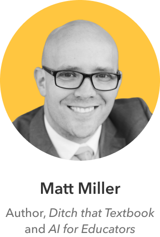 Matt Miller is a highly respected educator, speaker, and author, best known for Ditch That Textbook and AI for Educators. With a focus on empowering teachers to leverage technology in meaningful ways, Matt helps schools create engaging, effective classrooms that challenge traditional norms. His work with AI Tutors highlights their potential to foster critical thinking, personalize instruction, and enhance teacher-student connections, all while saving time and uncovering valuable learning insights.