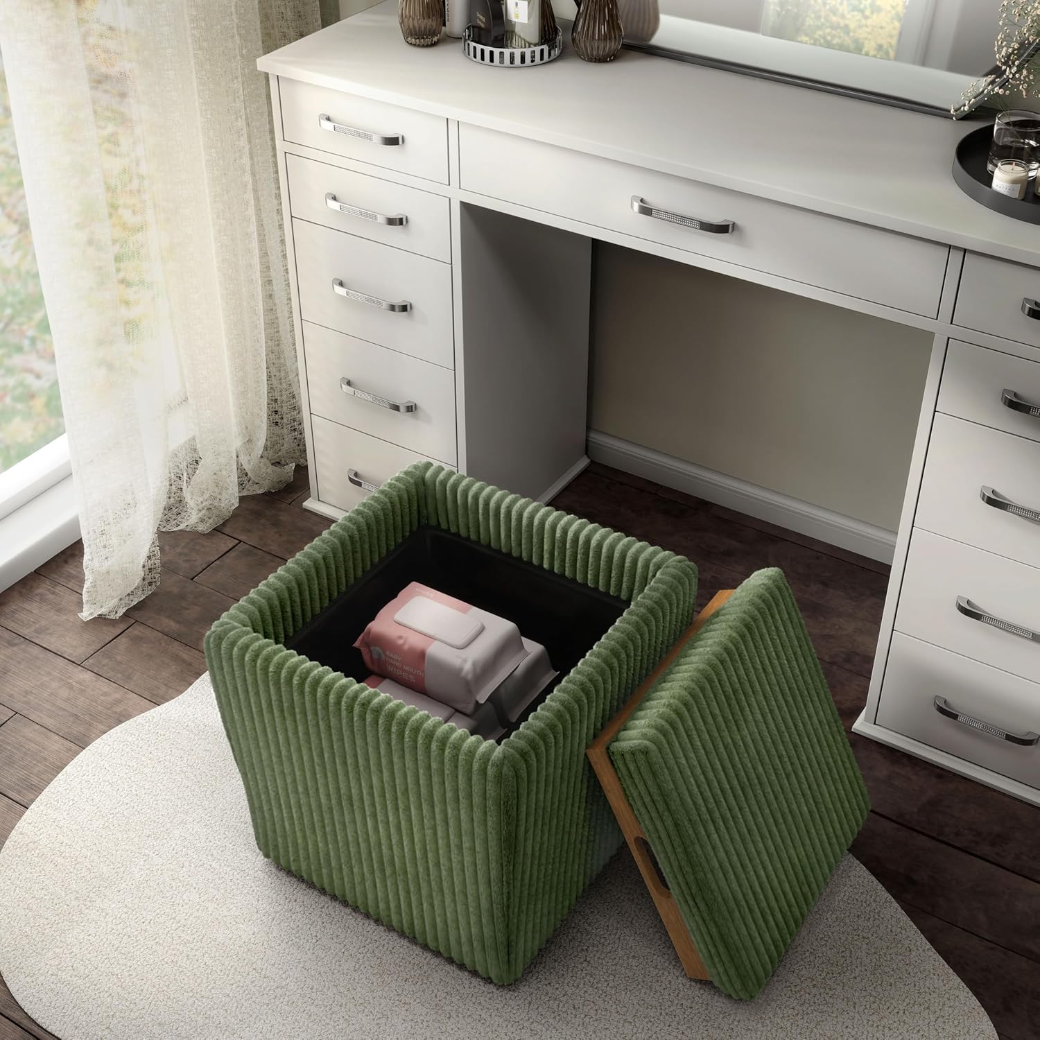 Elegant Versatility with StorageIntroduce modern elegance into your space with this round ottoman with storage, thoughtfully crafted to combine beauty and functionality.Featuring a reversible flip-top, this tufted storage ottoman transitions from a soft, padded seat to a smooth tabletop in seconds.Beneath the top lies a spacious storage compartment, complemented by a built-in air hole to promote circulation.Upholstered in chenille tufted fabric for a luxurious touch, its durable wood frame and sturdy black plastic legs ensure lasting performance.Arriving fully assembled, this fabric ottoman’s ready to elevate your décor instantly.Comfort Meets PracticalityPerfect for a variety of uses, this tufted storage ottoman offers superior relaxation with its high-density foam seat while doubling as a stylish coffee table.Store books, throws, or other essentials conveniently in the wood ottoman's roomy interior to keep your space neat.The upholstered ottoman's circular design and compact size make it ideal for cozy living spaces, bedrooms, or reading nooks.Protective footpads prevent scratches on your floors, ensuring this living room storage ottoman’s as functional as it is stylish.