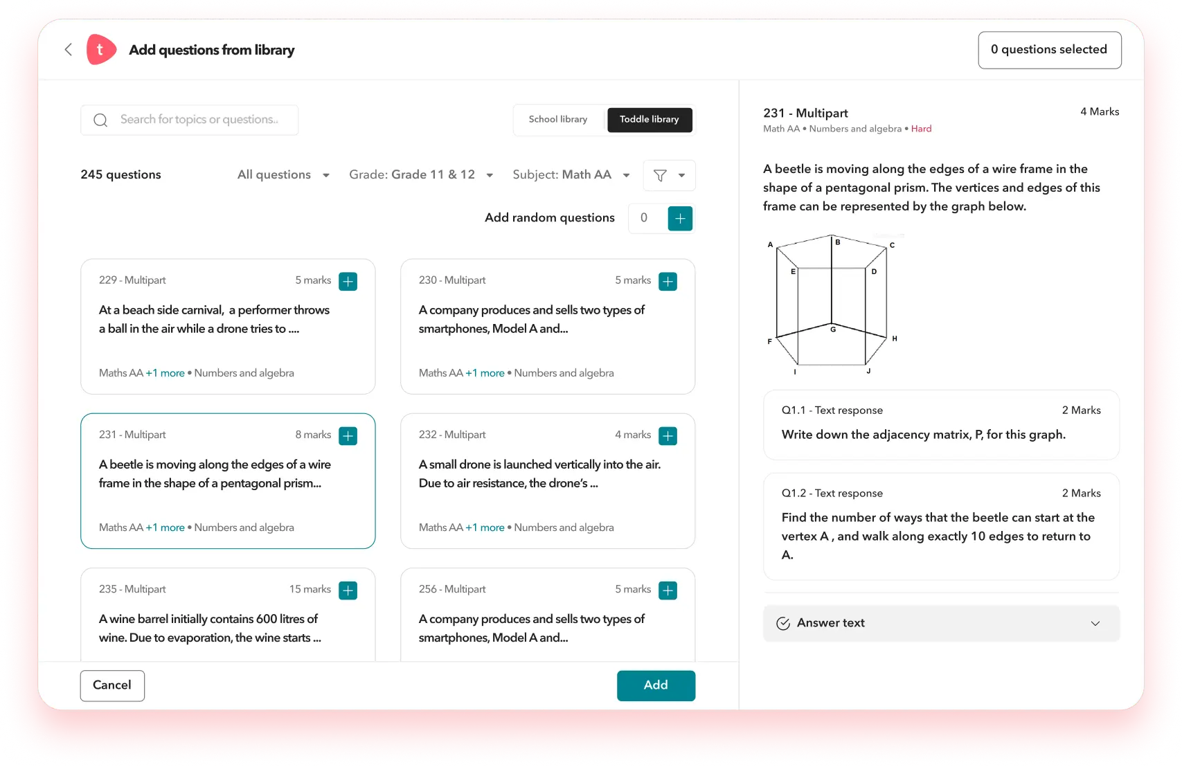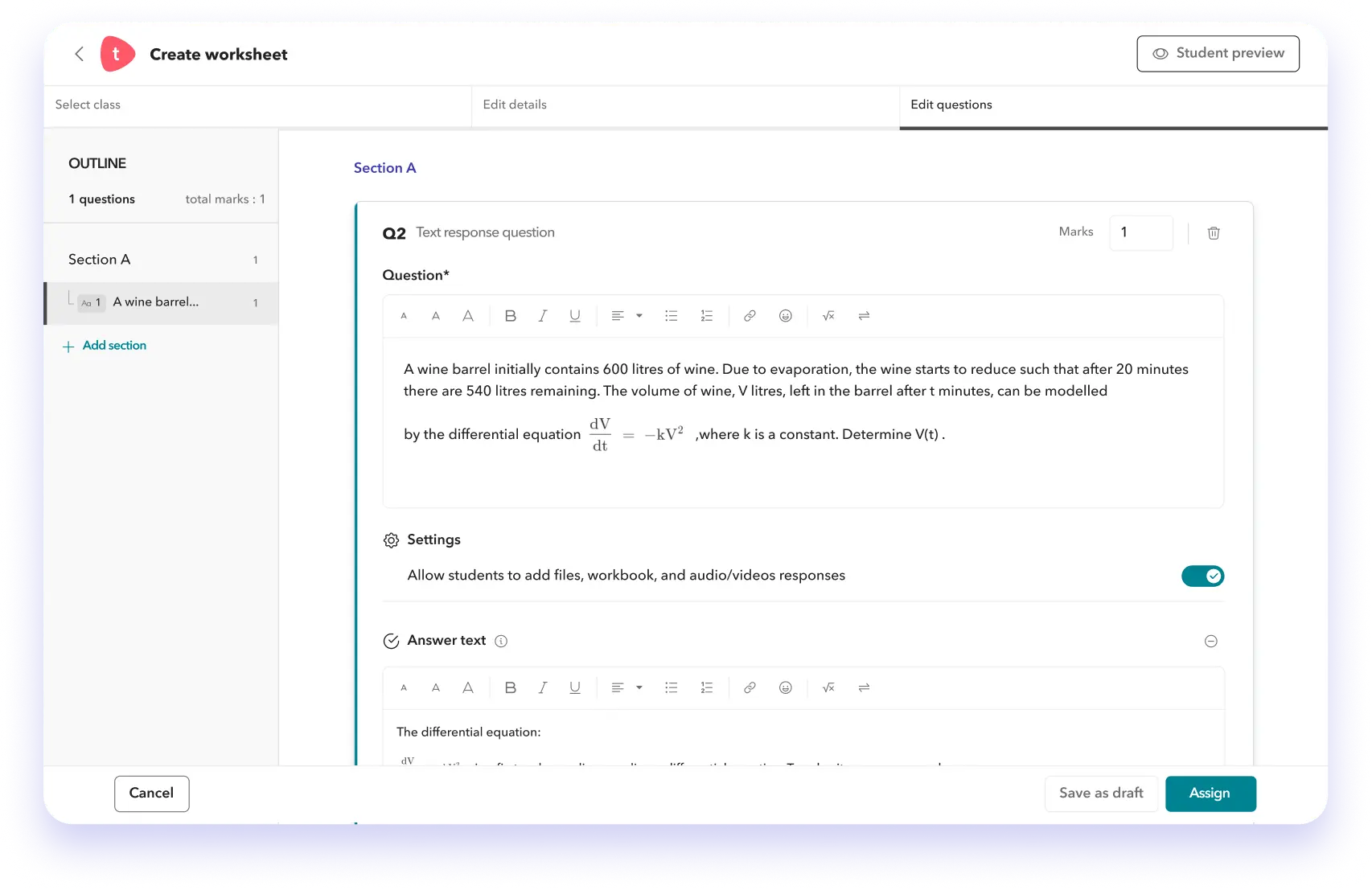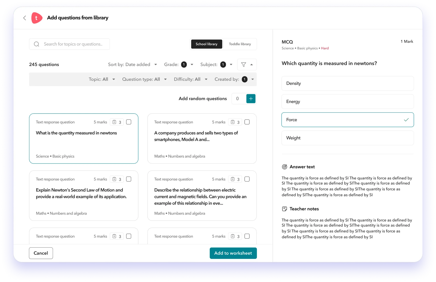 Build worksheets by selecting questions from the Toddle library or by adding your own questions.
