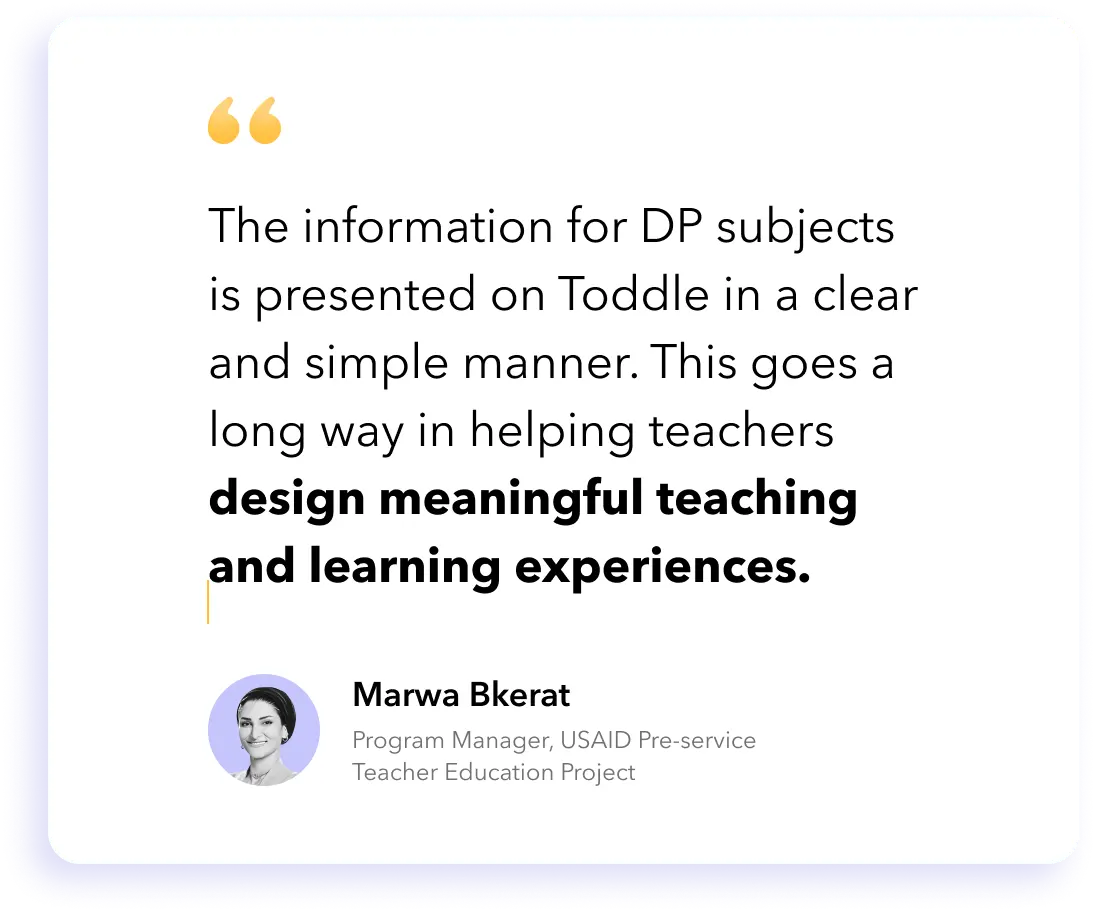 *The Toddle DP Library is currently available for 15 IBDP subjects - Biology, Business Management, Chemistry, Economics, English A: Language and Literature, English A: Literature, Environmental Systems and Societies, French, Global Politics, History, Mathematics: Analysis and Approaches, Mathematics: Applications and Interpretation, Physics, Psychology, Spanish. Our eventual goal is to cover most of the DP subjects.