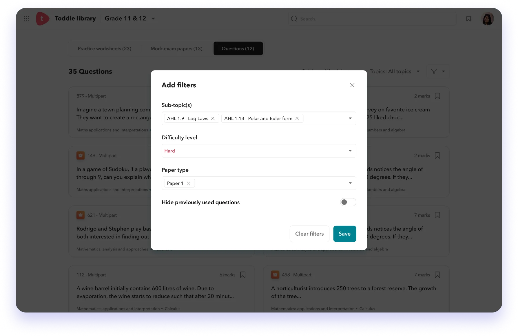 Design your own quizzes and question papers — select questions by topics, sub-topics, paper types, or levels(HL/SL).