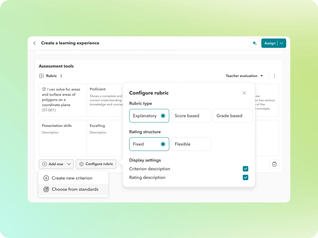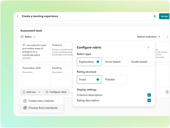 Build rubrics with custom or standards-based criteria. Configure for grade-based, score-based, or qualitative evaluation.