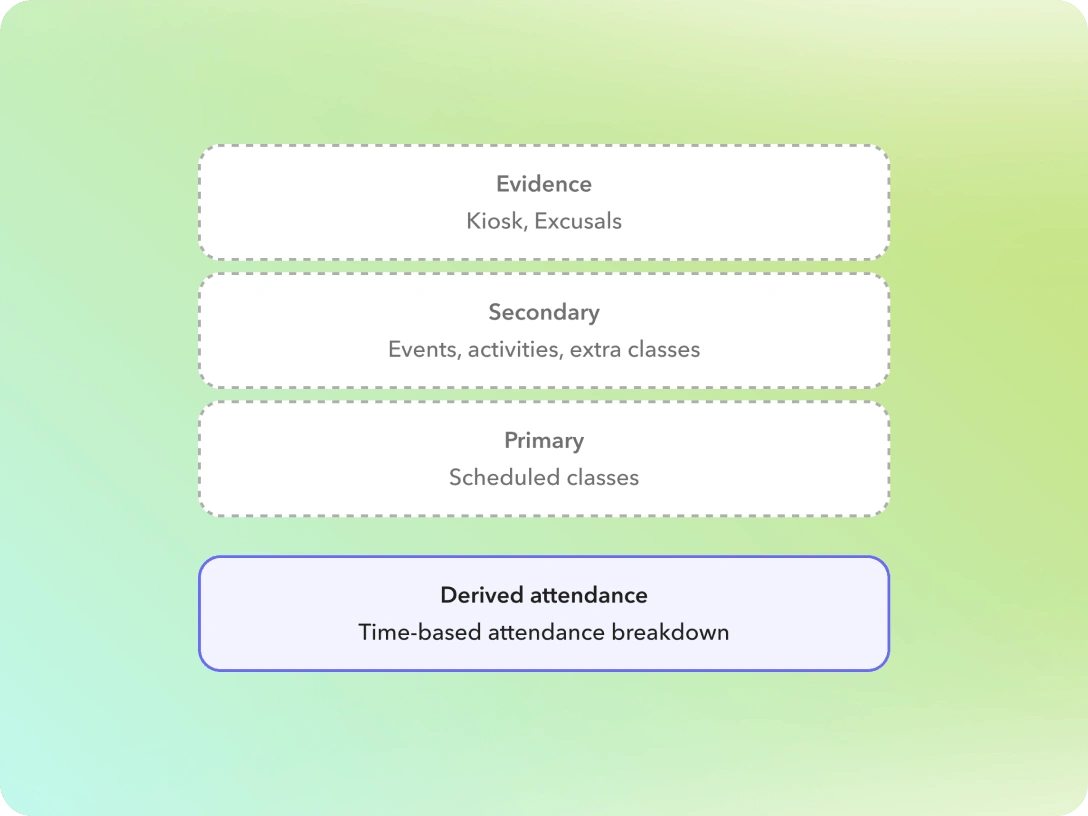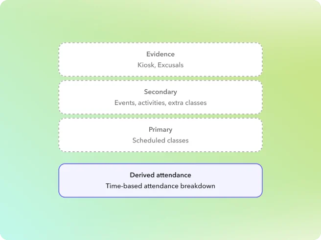 Flexible marking methods, multi-layered tracking across classes and activities, absence resolution workflows, and kiosk integrations.