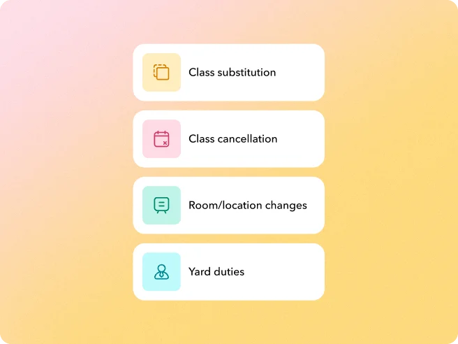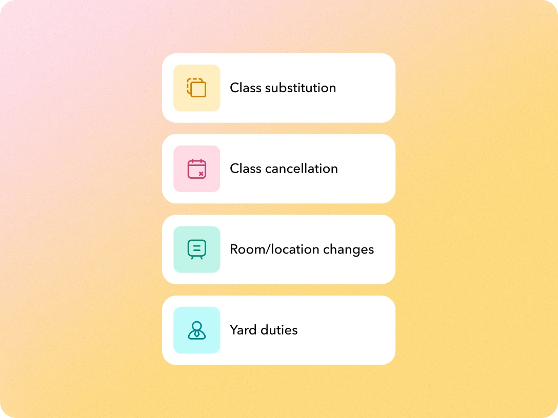 Assign a sub. Cancel a class. Swap a room. Manage daily timetable changes without leaving Toddle.