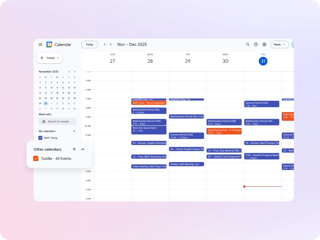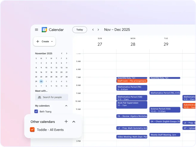 Sync Toddle events with Google Calendar, Outlook, or Teams. Create meeting links directly from Toddle's calendar.