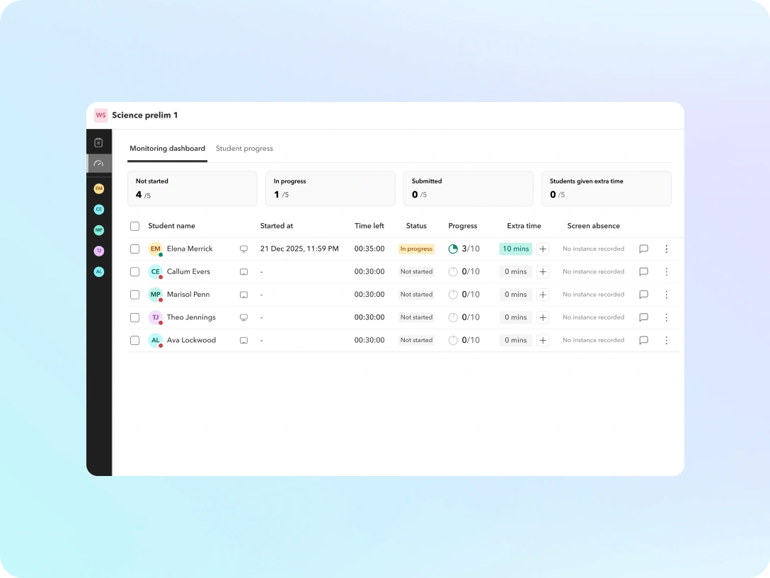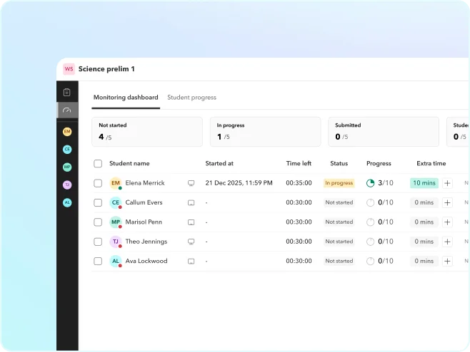 Monitor assessments in real time. Track progress, manage extra time, flag screen absence. All from one dashboard.
