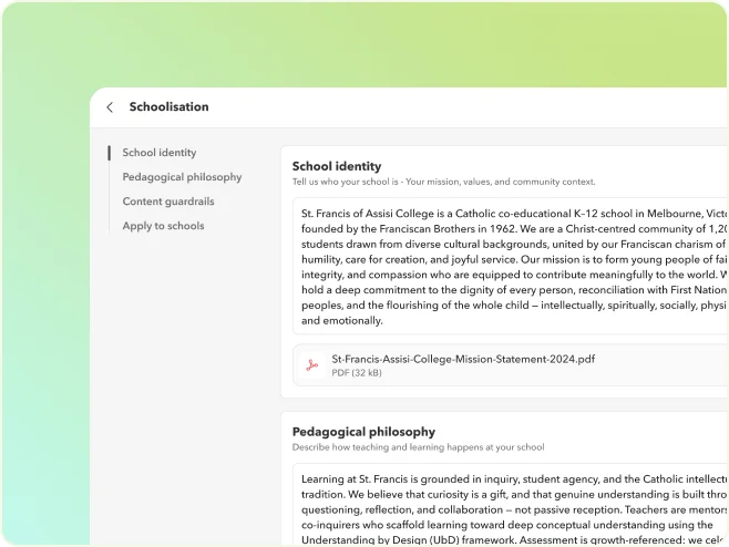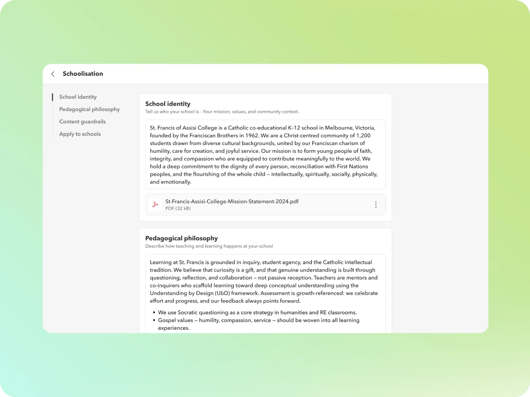 Configure your school's identity, pedagogy, and content guardrails so every AI tool on Toddle reflects your context.