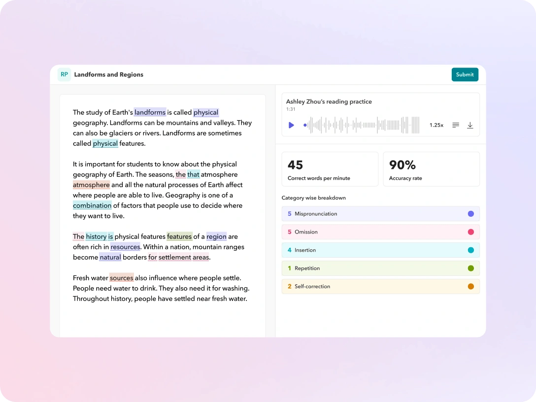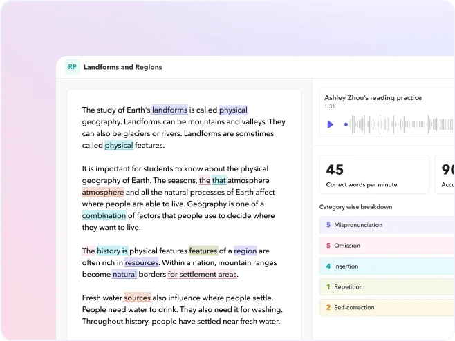 Students read aloud. AI analyzes fluency, accuracy, and specific errors like mispronunciation, omission, and repetition.