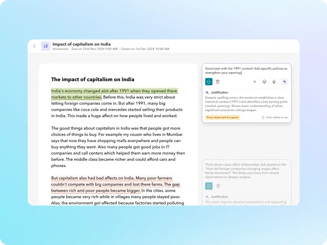 AI reads the student's work, leaves detailed annotations, and gives teachers a first pass they can review and refine. Deep feedback, delivered fast.