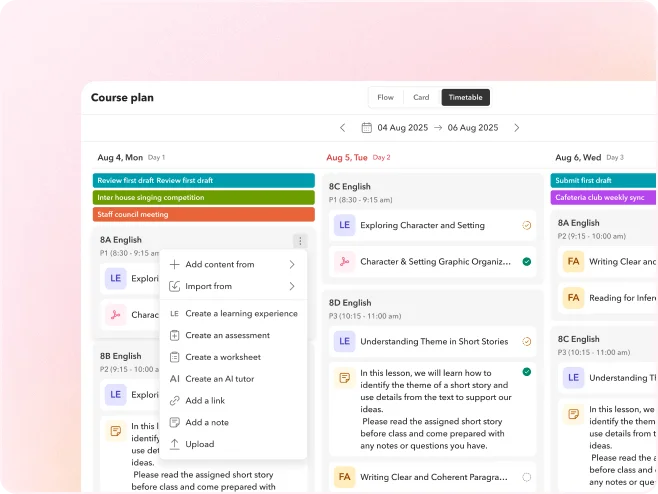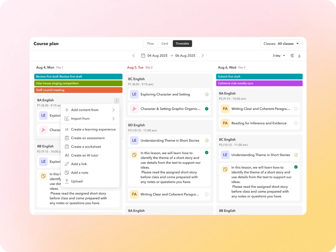 Course planning and timetabling now in one view. Attach lessons to periods, see the full day at a glance.