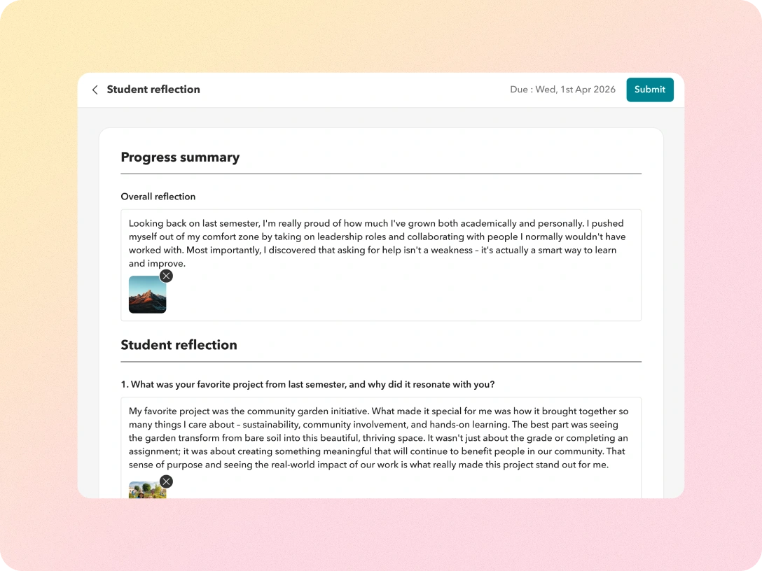 Add reflection prompts to report templates. Students contribute their voice directly to their own progress reports.