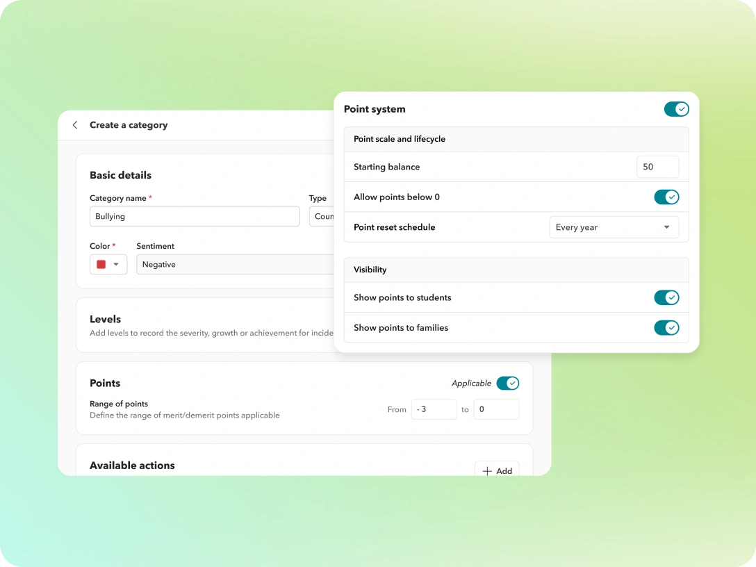 Award or deduct points per incident. Define ranges, set reset schedules, control what students and families see.