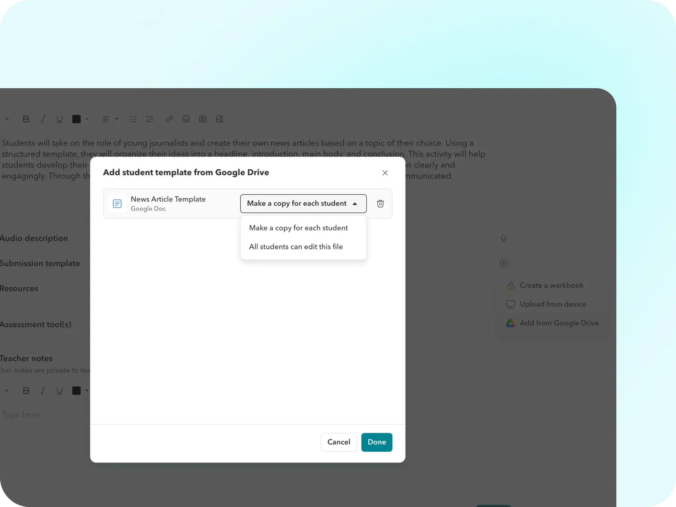 Enable your students to access Google resources, documents, and assessments directly in Toddle without any back & forth.